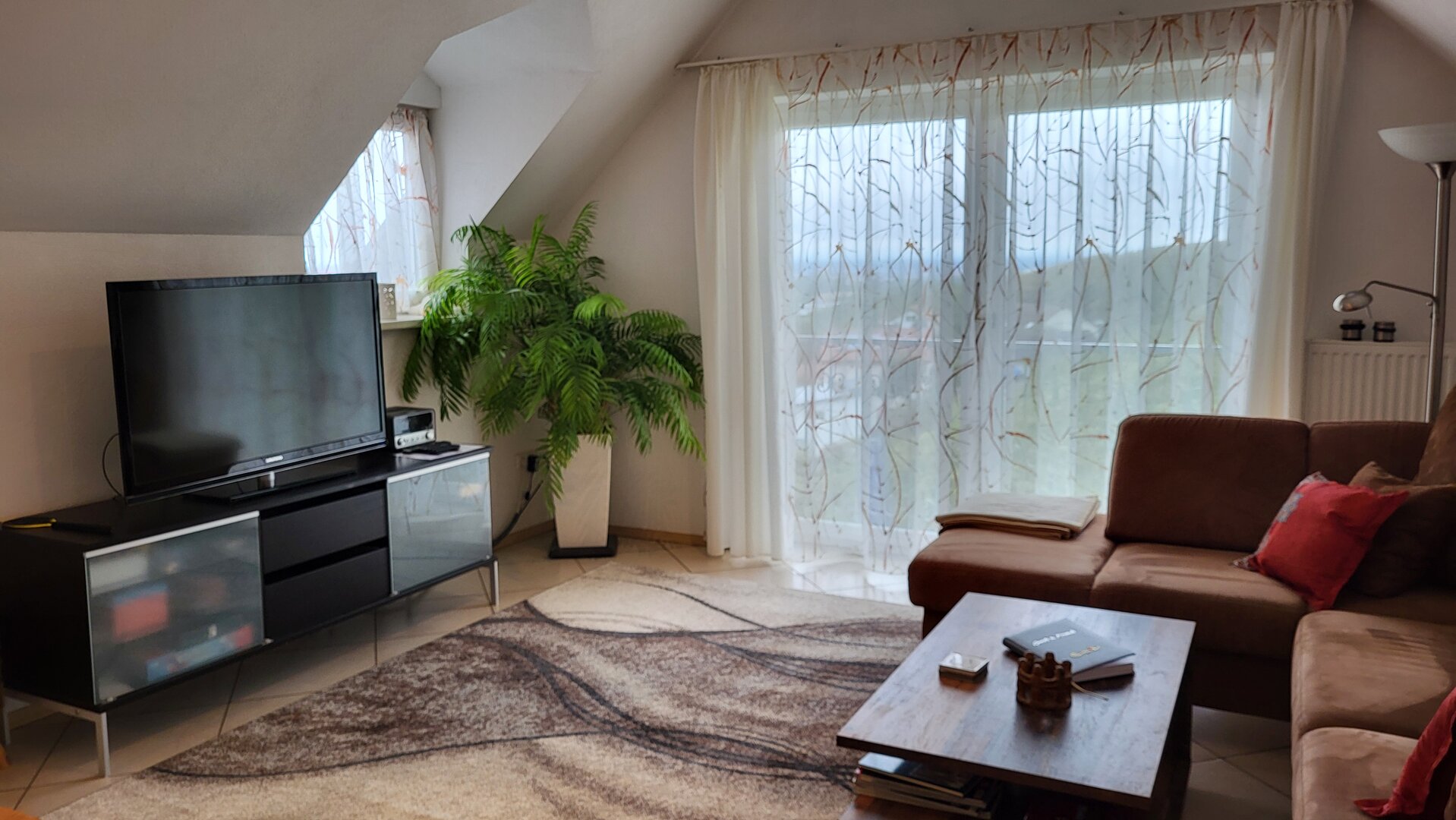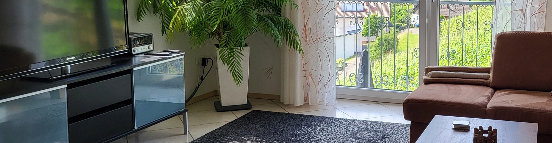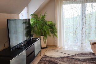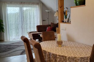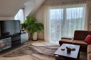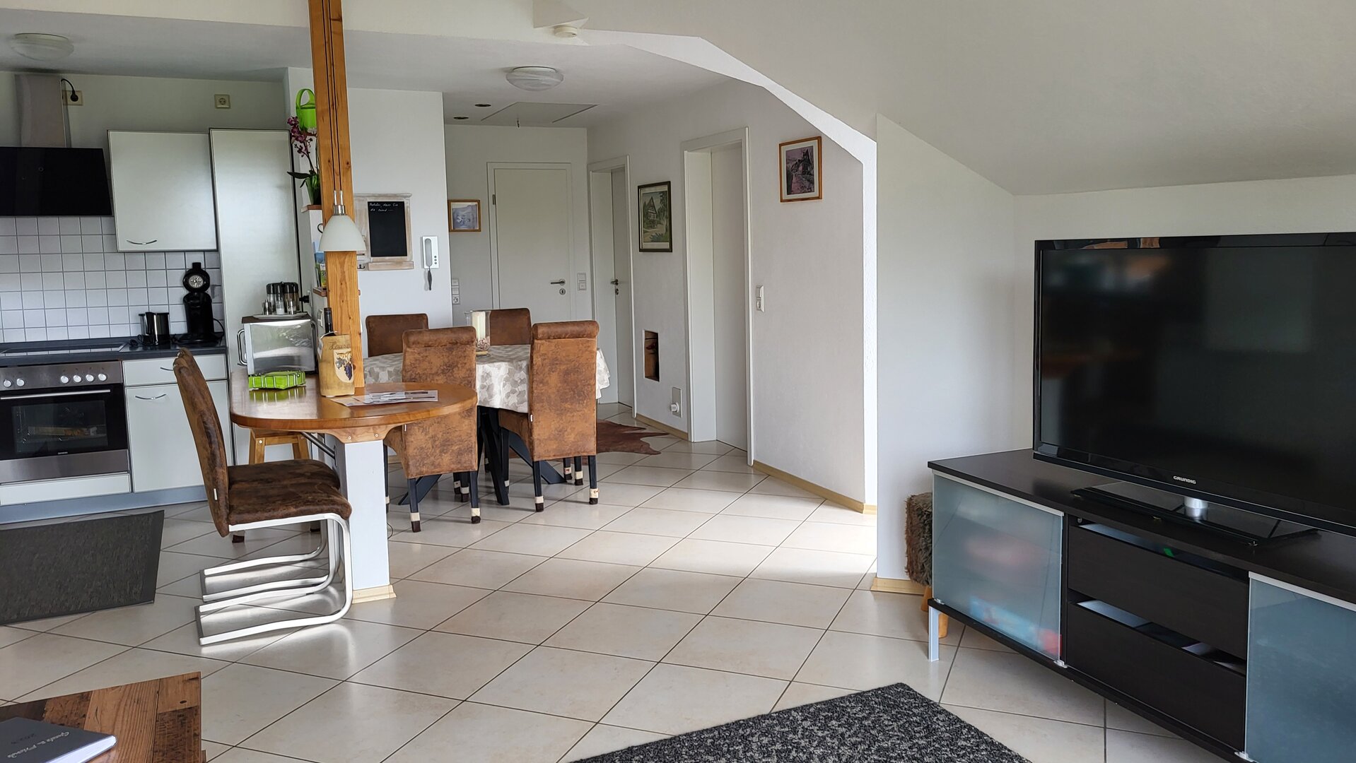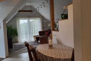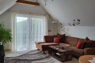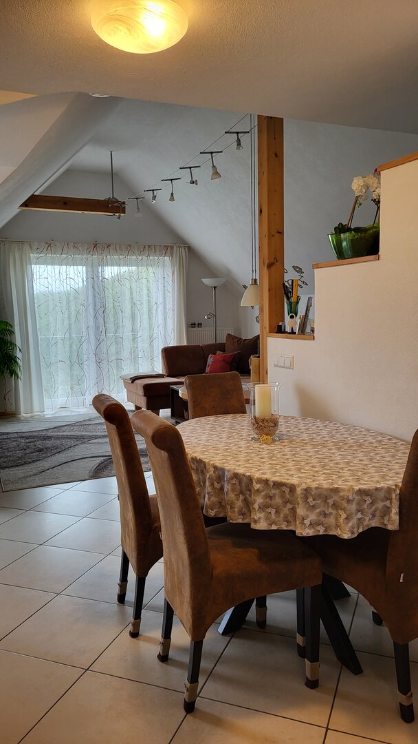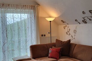 Der gemütliche, offene Wohnraum wurde mit sehr viel Liebe hergerichtet. Die einladende, große Couch macht Lust auf einen schönen Fernseh- und Musikabend. Oder atmen Sie am großen Fenster durch — der Blick reicht bei gutem Wetter bis hin zum Straßburger Münster oder auf die Vogesen in Frankreich.