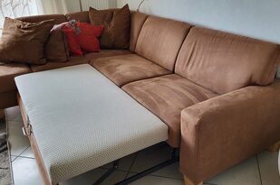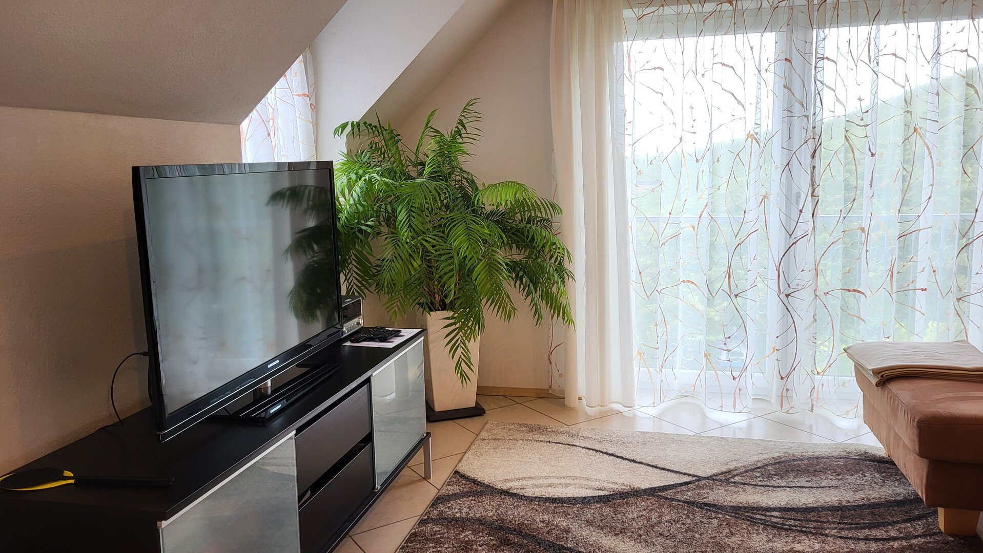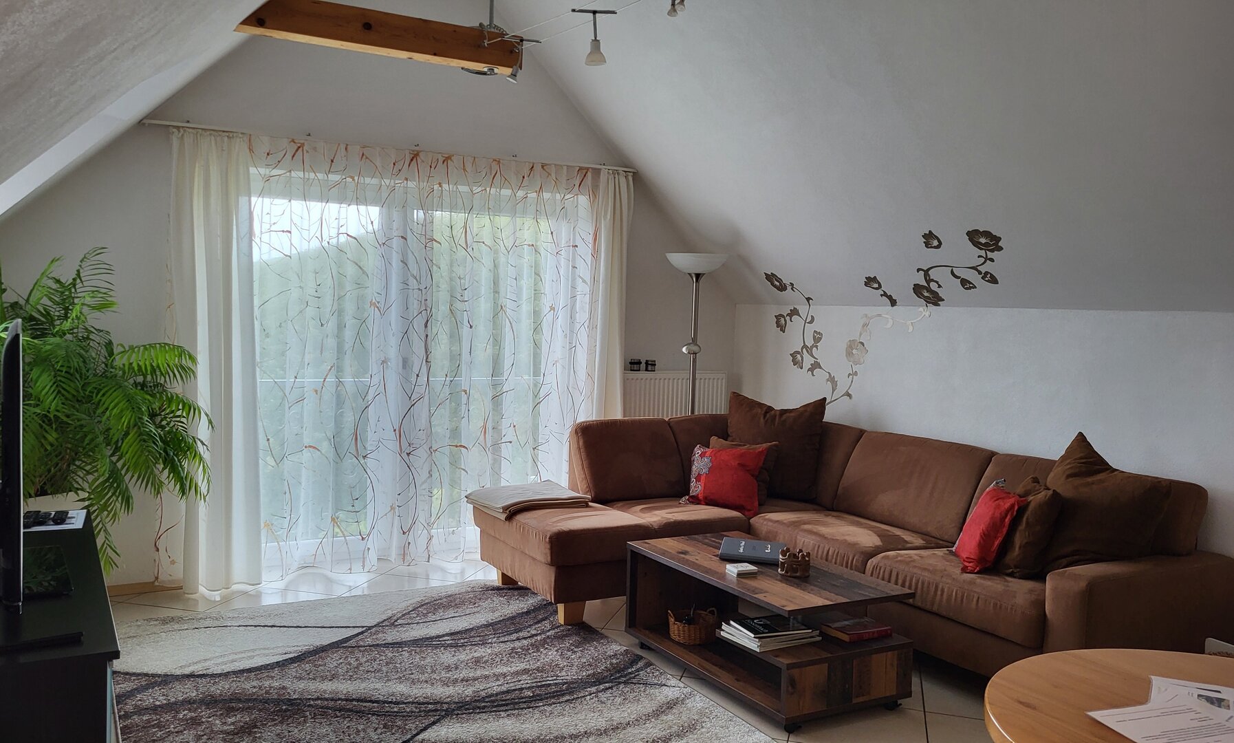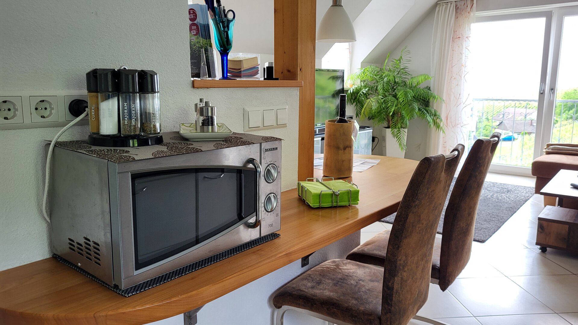 Der gemütliche, offene Wohnraum wurde mit sehr viel Liebe hergerichtet. Die einladende, große Couch macht Lust auf einen schönen Fernseh- und Musikabend. Oder atmen Sie am großen Fenster durch — der Blick reicht bei gutem Wetter bis hin zum Straßburger Münster oder auf die Vogesen in Frankreich.