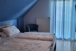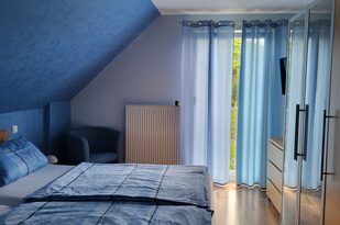 Das geschmackvoll in blau gehaltene Zimmer ist mit einem 2m-breiten Doppelbett ausgestattet. In diesem Zimmer haben Sie außerdem einen Fernseher (Kabelfernsehen) sowie einen Kleiderschrank und zwei Nachtschränkchen, welche zusätzlichen Platz bieten.