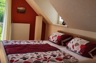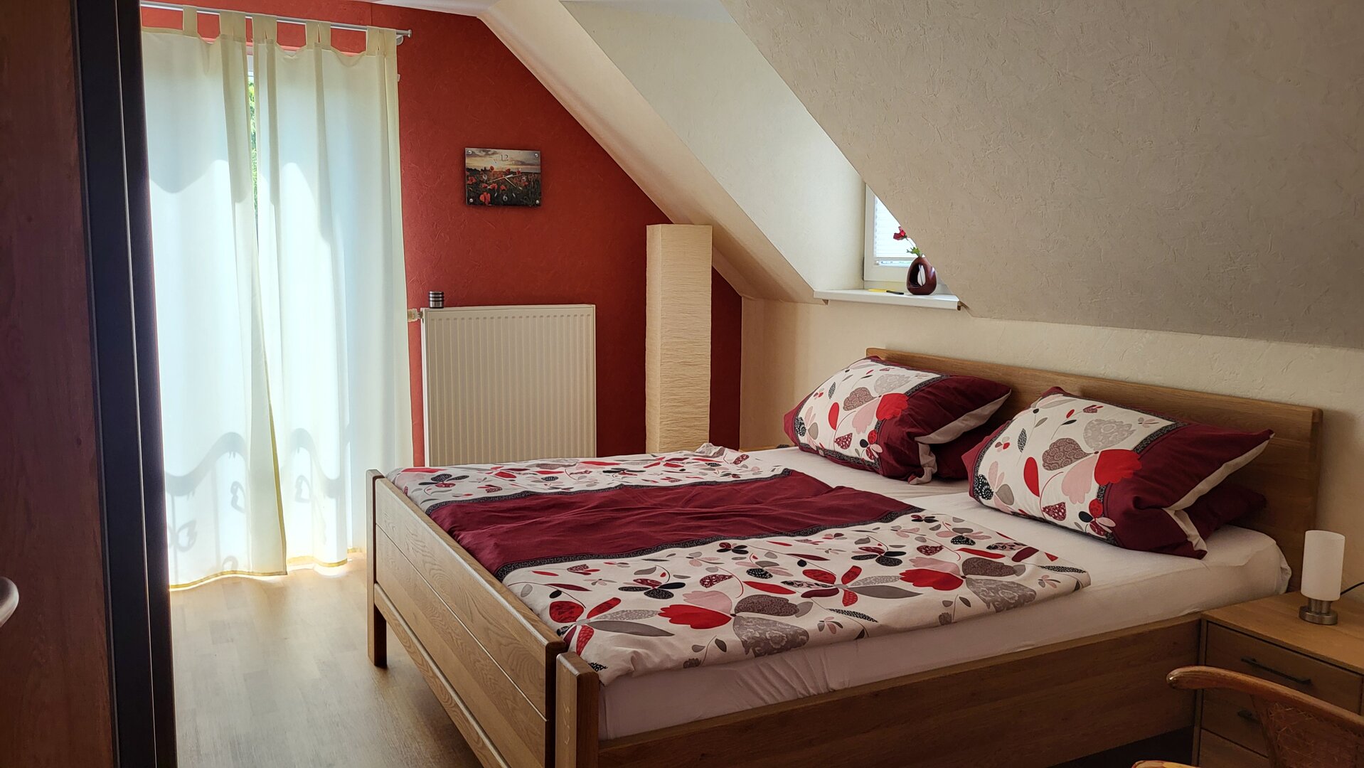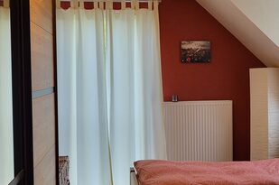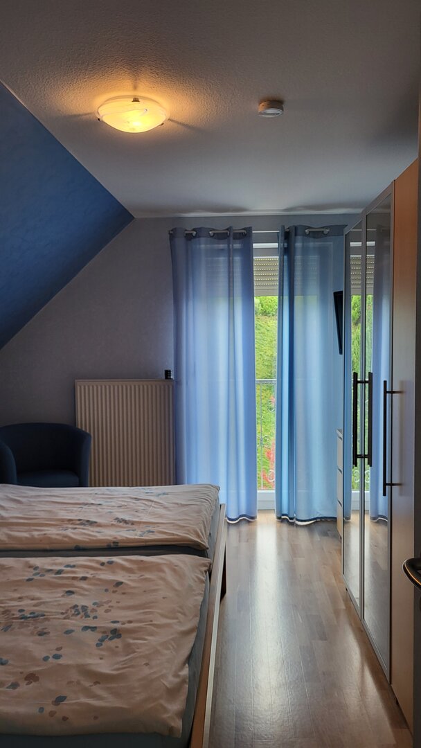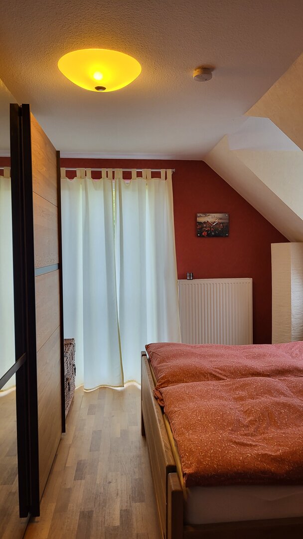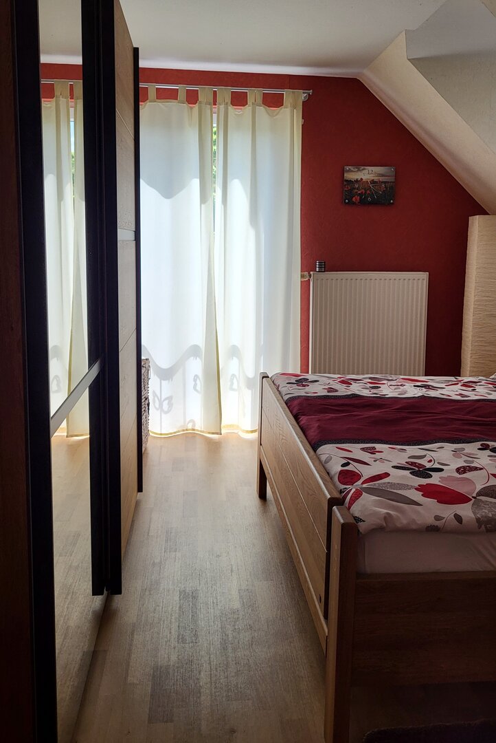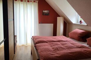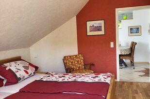 Dieses Zimmer mit einem bequemen Doppelbett überrascht durch seine warme rote Farbe. Neben der großen Glastür hat das Zimmer eine Dachgaube zur Dachterrasse mit Blick auf Offenburg. Ein Schrank und zwei Nachttischchen bieten Ihnen genügend Stauraum. Beide Zimmer sind mit pflegeleichtem PVC-Fußboden ausgestattet, so dass sich auch Allergiker wohlfühlen.