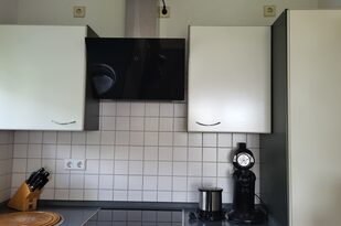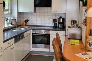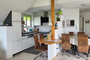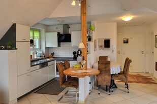 In der offenen Küche finden Sie alles, was Sie für die Selbstversorgung benötigen. Sie ist mit einem Elektroherd mit Cerankochfeld und Backofen, einer Mikrowelle sowie einem Kühlschrank mit Eisfach ausgestattet. Ein Geschirrspüler ist ebenfalls vorhanden, damit auch für die Hausfrau oder den Hausmann der Aufenthalt zum Urlaub wird. Gleich neben der Küche befindet sich der Esstisch mit bequemen Stühlen. Der Tisch bietet ausgezogen Platz für 6 Personen. Zusätzlich steht Ihnen ein Elektrogrill auf der Dachterrasse zur Verfügung.