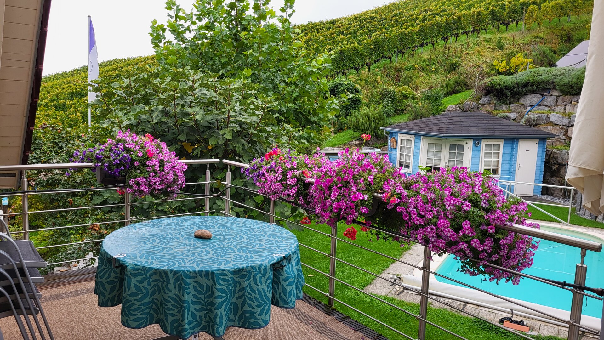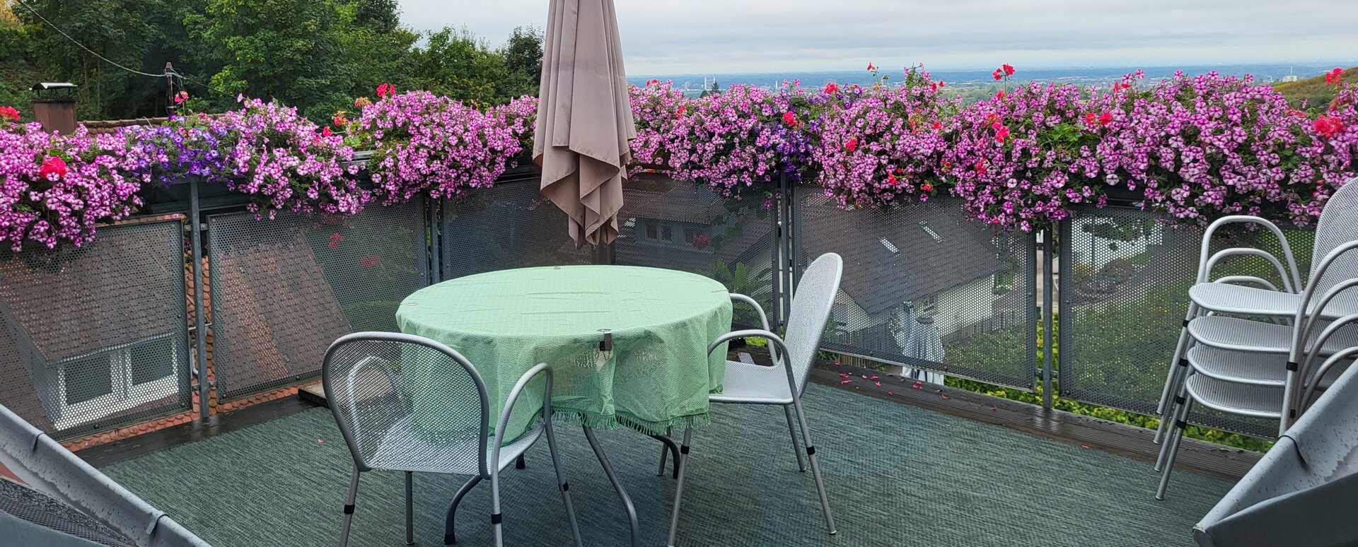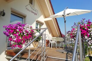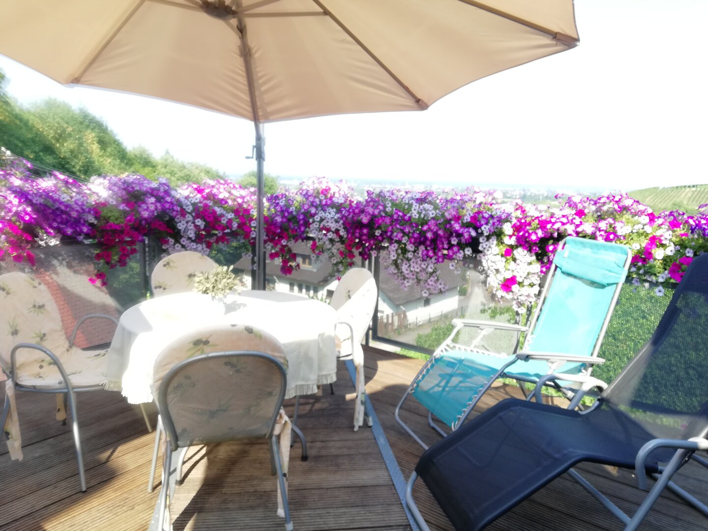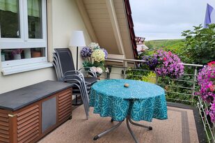 Hier können Sie gemütlich essen, bei herrlichem Wetter ein Sonnenbad nehmen oder abends die Ruhe und den wundervollen Ausblick genießen. Da die Wohnung eine Nichtraucherwohnung ist, bieten wir unseren rauchenden Gästen auf der Terrasse einen komfortablen Platz.