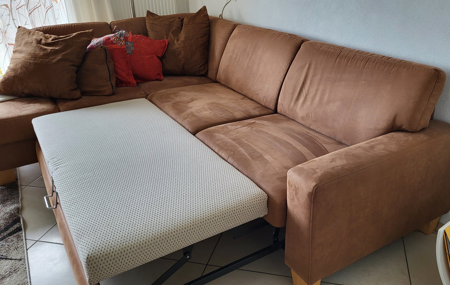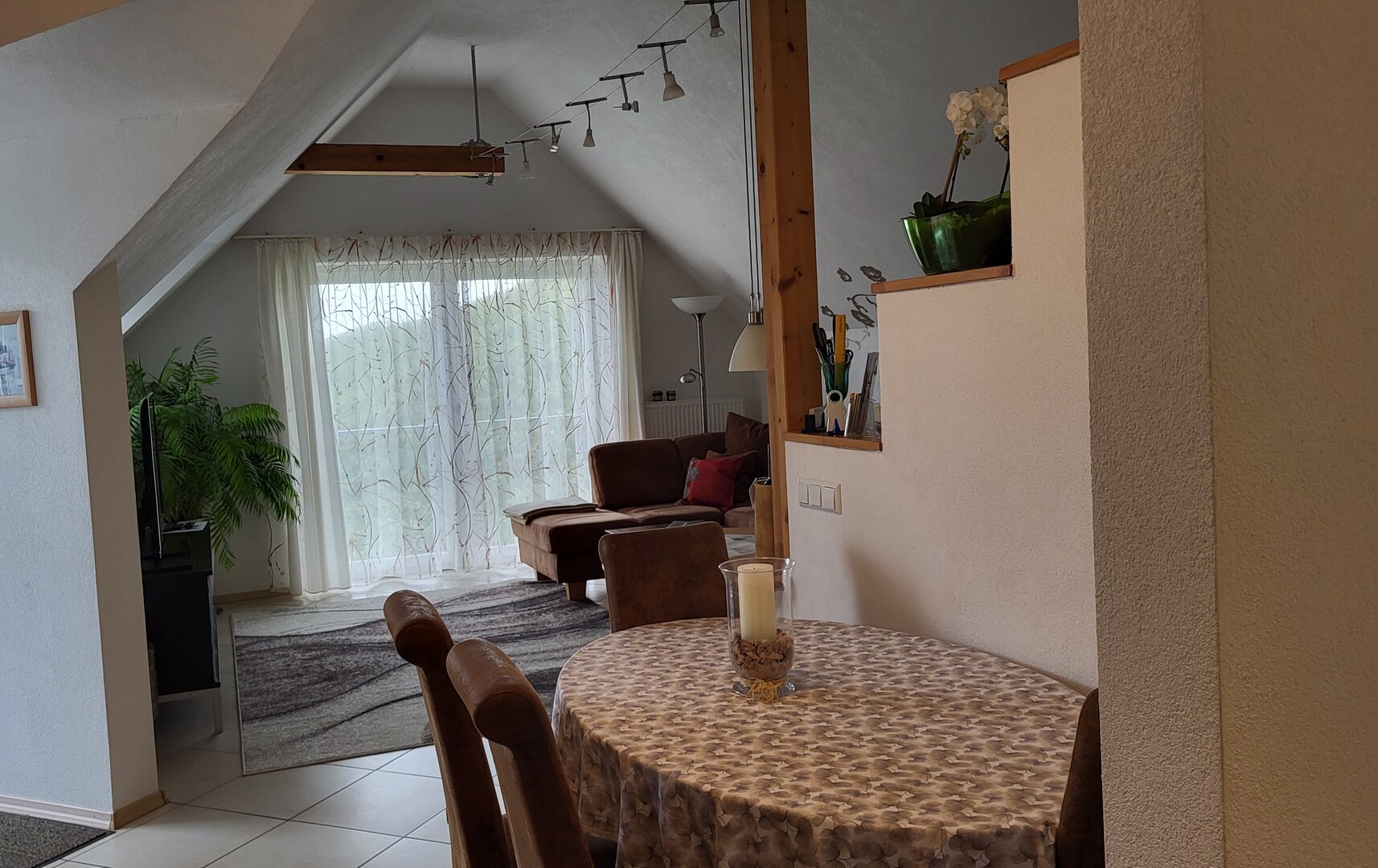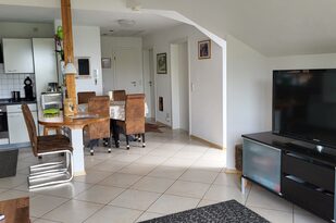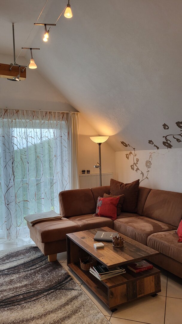 Der gemütliche, offene Wohnraum wurde mit sehr viel Liebe hergerichtet. Die einladende, große Couch macht Lust auf einen schönen Fernseh- und Musikabend. Oder atmen Sie am großen Fenster durch — der Blick reicht bei gutem Wetter bis hin zum Straßburger Münster oder auf die Vogesen in Frankreich.
