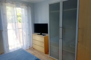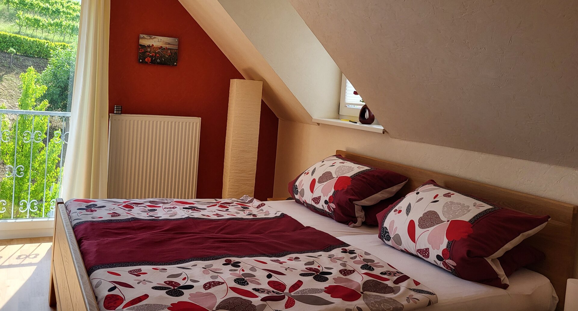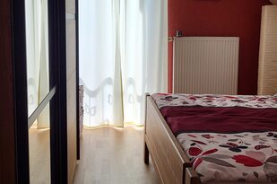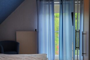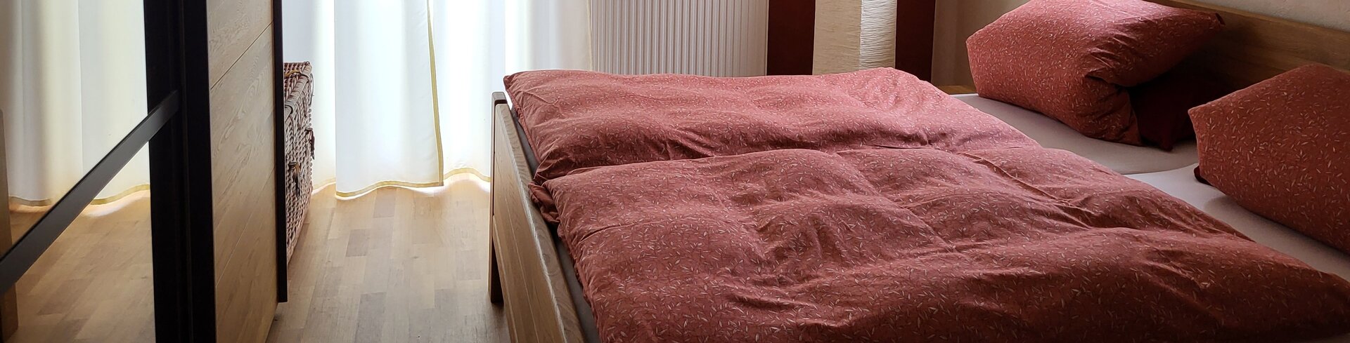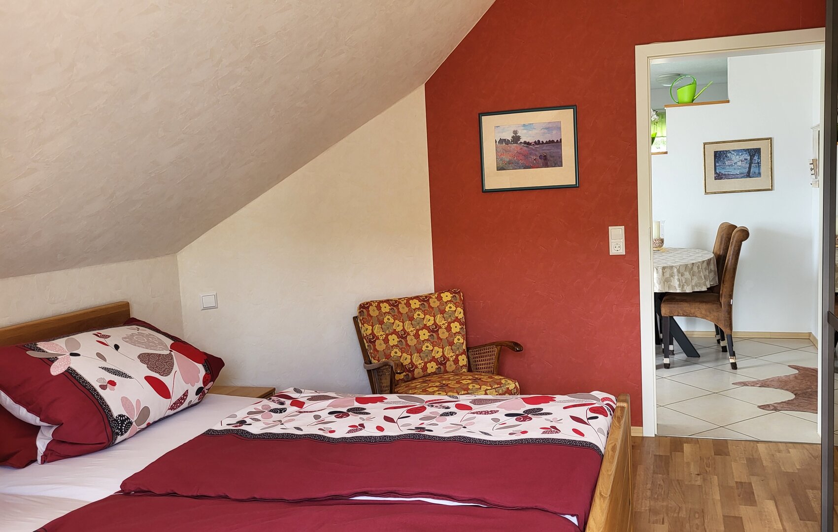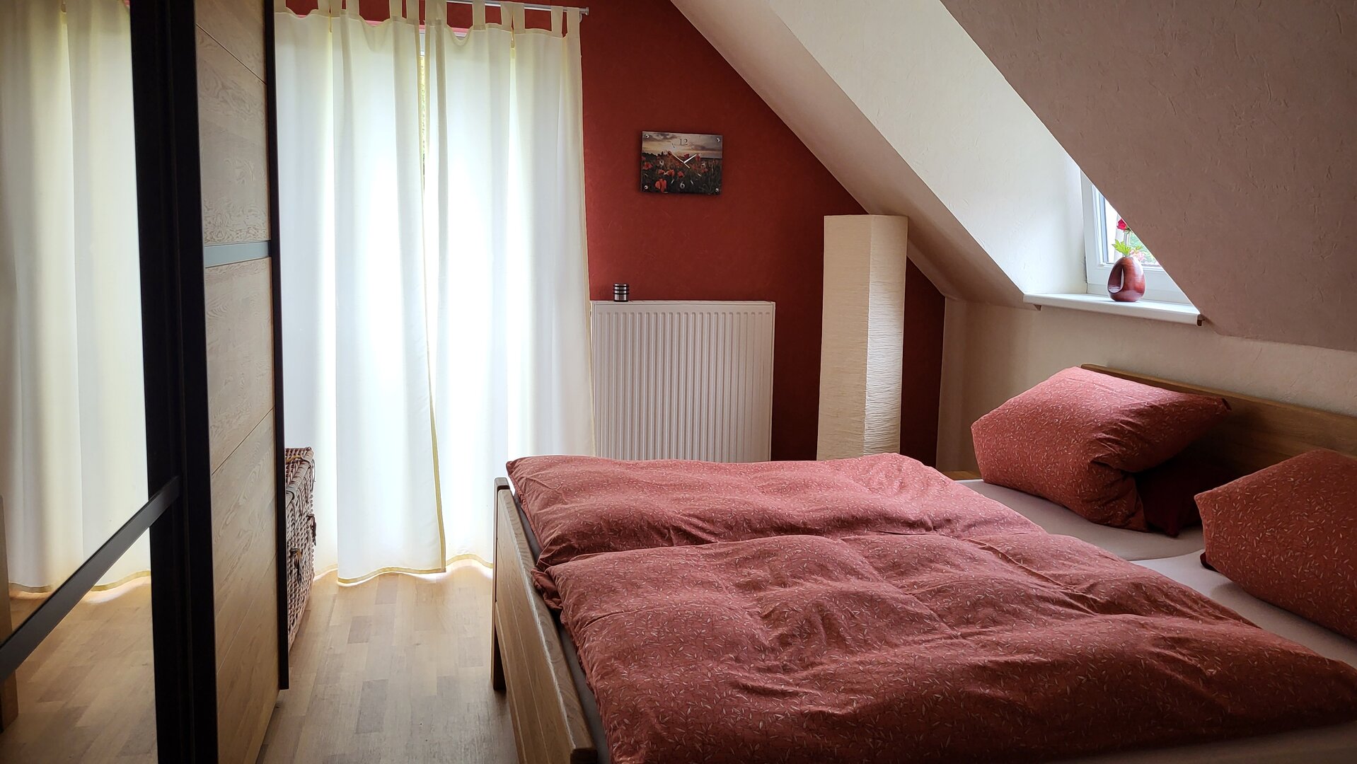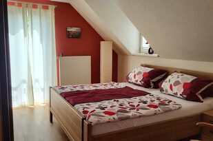 Dieses Zimmer mit einem bequemen Doppelbett überrascht durch seine warme rote Farbe. Neben der großen Glastür hat das Zimmer eine Dachgaube zur Dachterrasse mit Blick auf Offenburg. Ein Schrank und zwei Nachttischchen bieten Ihnen genügend Stauraum. Beide Zimmer sind mit pflegeleichtem PVC-Fußboden ausgestattet, so dass sich auch Allergiker wohlfühlen.