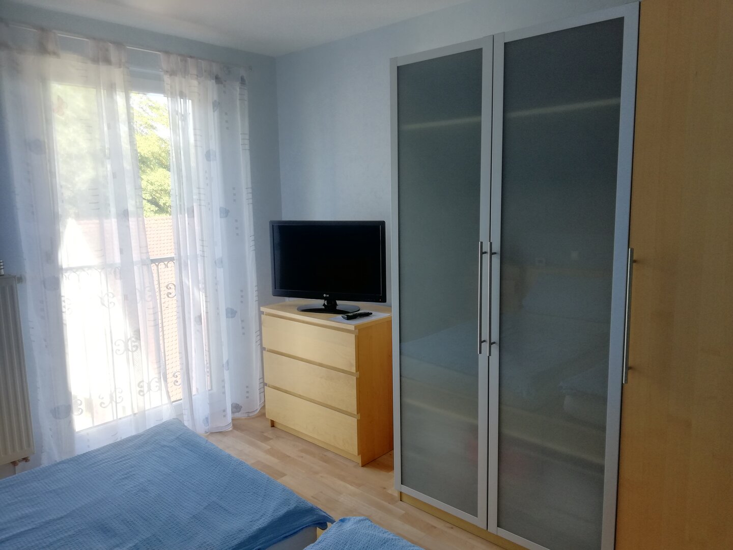 Das geschmackvoll in blau gehaltene Zimmer ist mit einem 2m-breiten Doppelbett ausgestattet. In diesem Zimmer haben Sie außerdem einen Fernseher (Kabelfernsehen) sowie einen Kleiderschrank und zwei Nachtschränkchen, welche zusätzlichen Platz bieten.