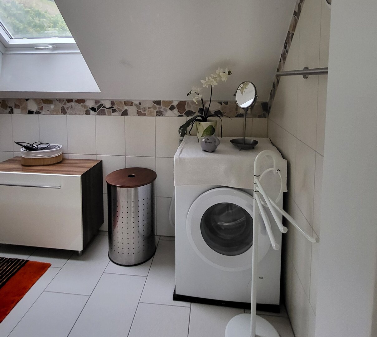 Das Badezimmer ist mit einem WC, Waschbecken, ebenerdigen Dusche und einer Waschmaschine ausgestattet. Durch das Dachfenster sehen Sie die angrenzenden Reben und den Wald. So wird die morgendliche Toilette zum Vergnügen.
