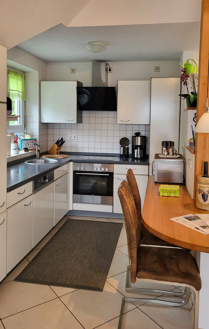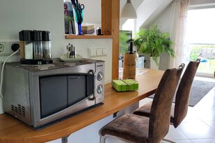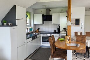 In der offenen Küche finden Sie alles, was Sie für die Selbstversorgung benötigen. Sie ist mit einem Elektroherd mit Cerankochfeld und Backofen, einer Mikrowelle sowie einem Kühlschrank mit Eisfach ausgestattet. Ein Geschirrspüler ist ebenfalls vorhanden, damit auch für die Hausfrau oder den Hausmann der Aufenthalt zum Urlaub wird. Gleich neben der Küche befindet sich der Esstisch mit bequemen Stühlen. Der Tisch bietet ausgezogen Platz für 6 Personen. Zusätzlich steht Ihnen ein Elektrogrill auf der Dachterrasse zur Verfügung.